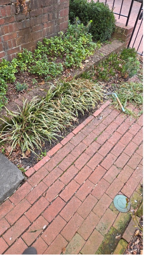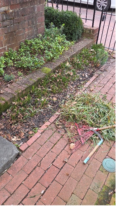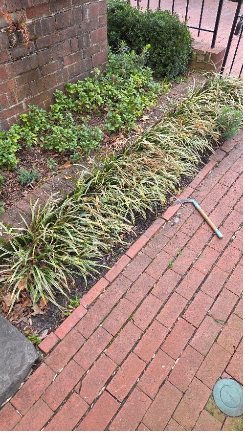 Cutting back hellebores and liriope puts us in exactly the same posture: crouching, reaching, bending, lots of hand work.