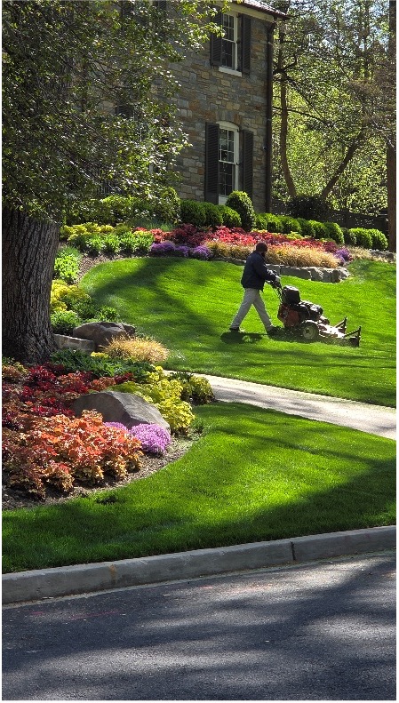 Finally, even through the summer, in our finer gardens with turf, the mow is always first — before the gardeners head across.