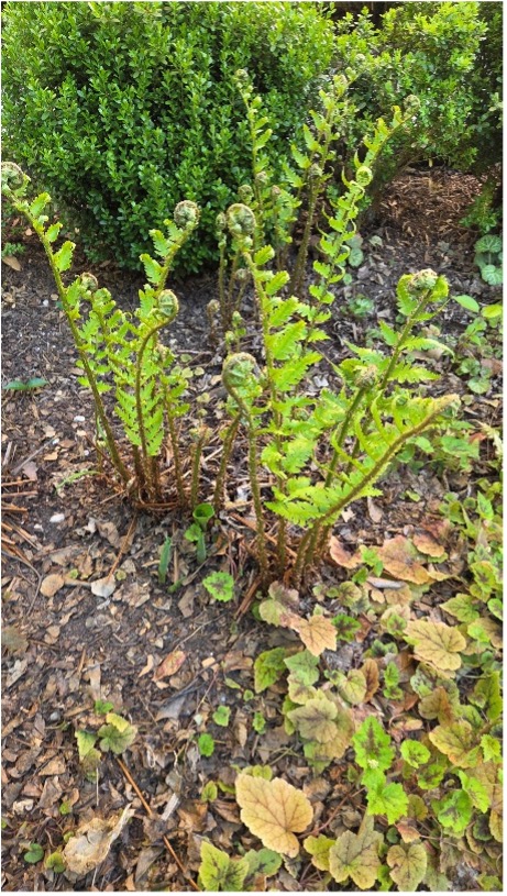In many of the gardens right now, the first push of perennials and ferns is underway — often in places we have forgotten. Most perennials have been gone for so long, since last autumn, and ferns cut back earlier in the spring are easy to miss.