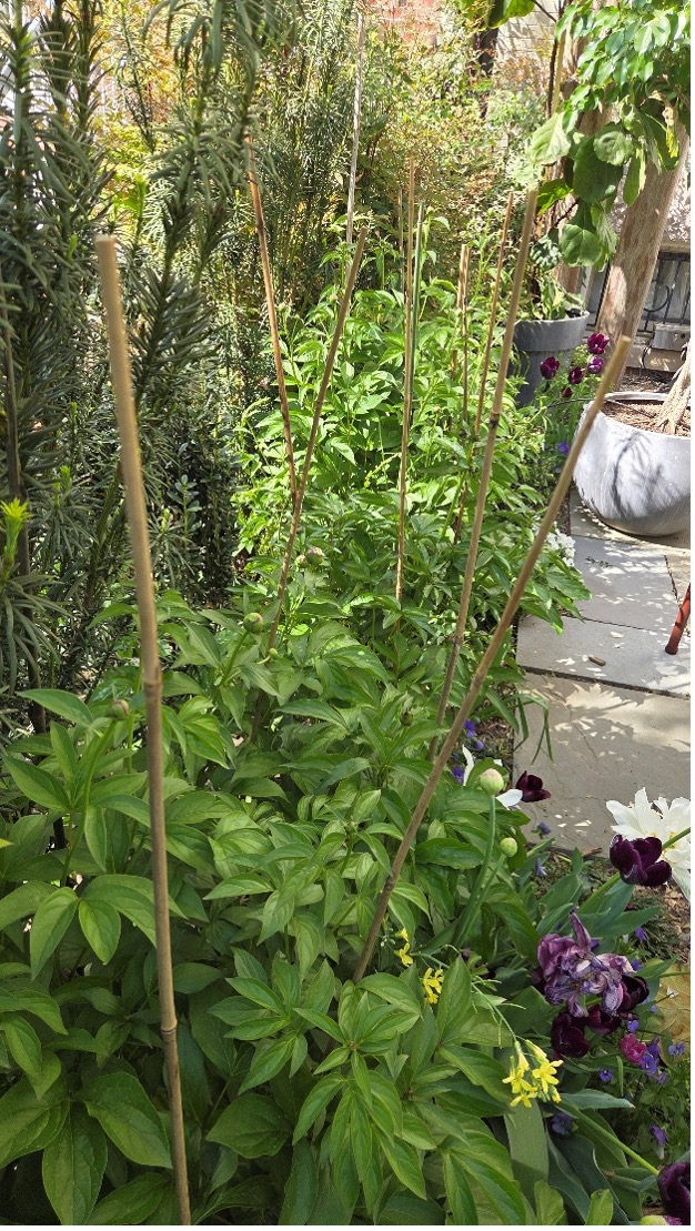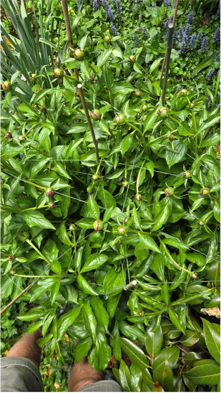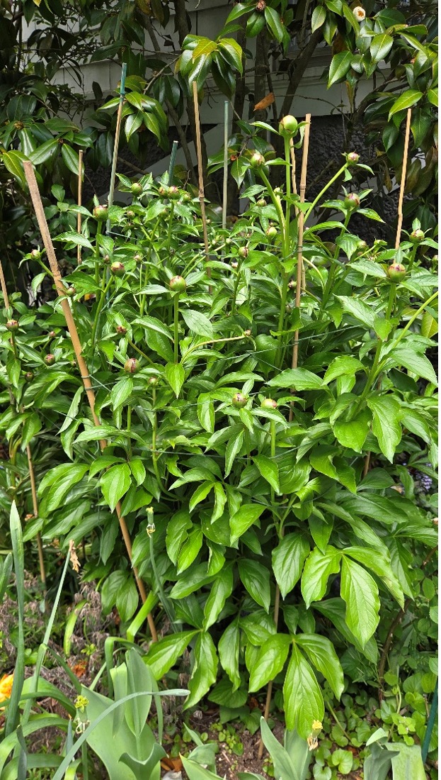 You’ll want to place an odd number of stakes around the perimeter of the peony, spaced roughly 12–18 inches apart. If the plant is smaller — say with only six or seven buds — you may need only three stakes. If it’s pushing twenty flowers, it could take seven or nine.