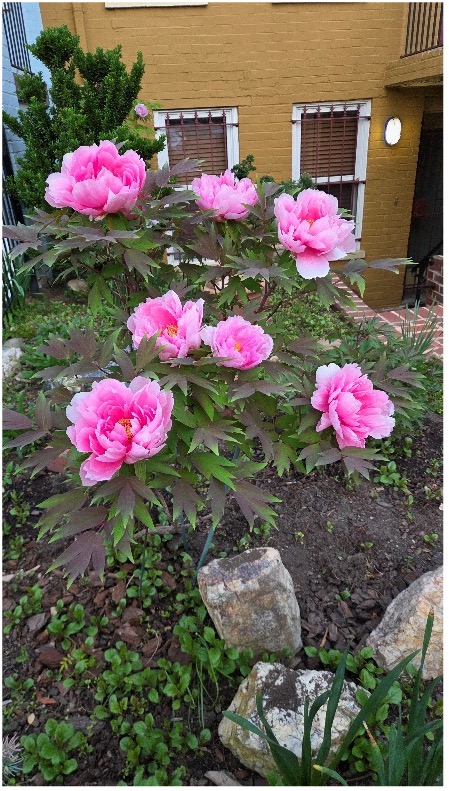 First come the tree peonies, with their amazingly large flowers — like something from a clown’s lapel. These are woody perennial shrubs, their stiff stems staying up through the winter, and they generally do not need staking to support their humongous flowers.